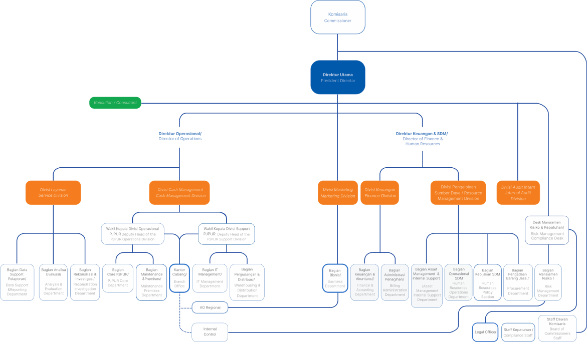 Struktur organisasi Perusahaan telah dikaji dan diselaraskan dengan Visi dan Misi Perusahaan serta mempertimbangkan perkembangan dan kebutuhan Perusahaan.